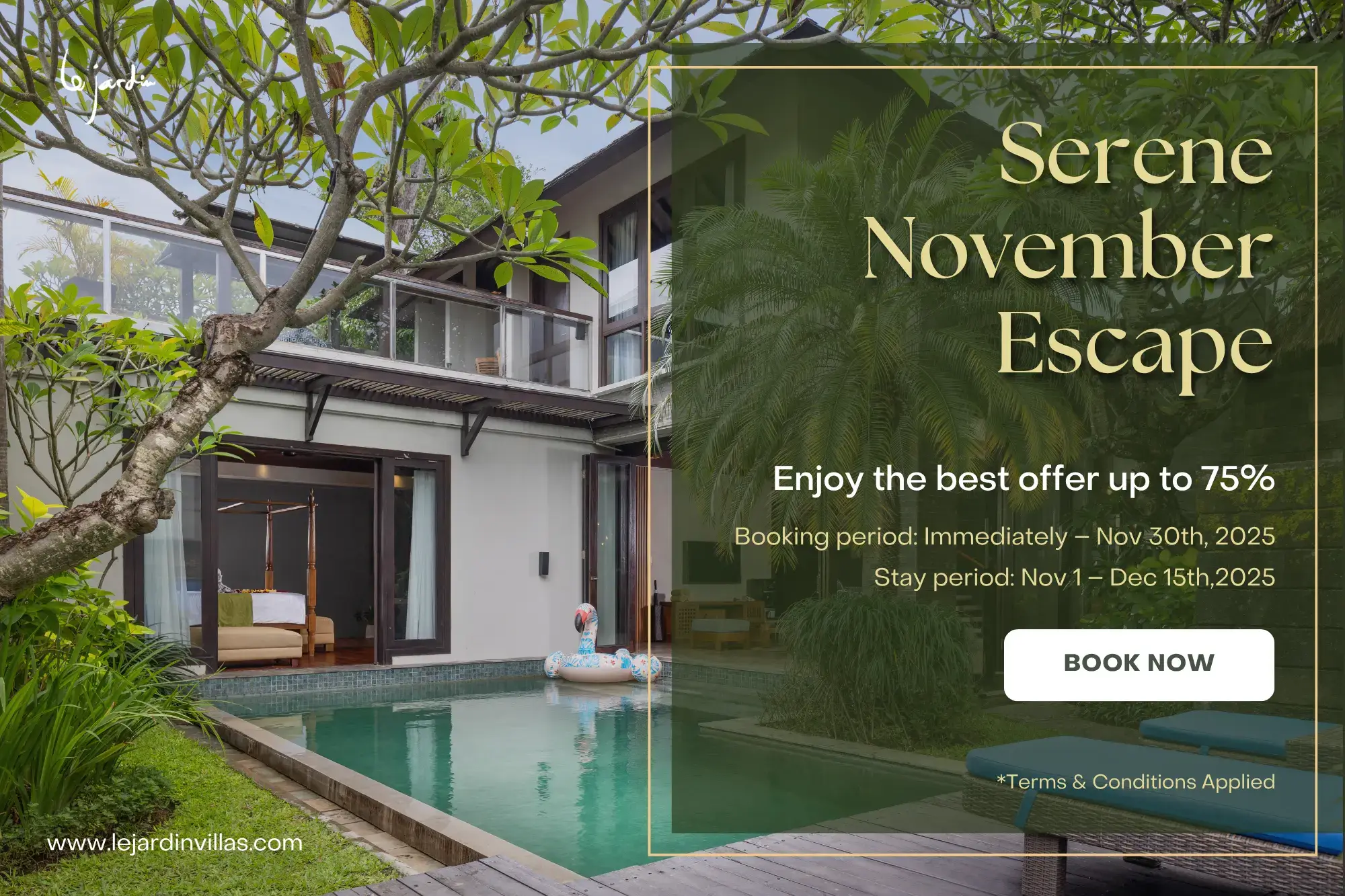 Embrace the tranquillity of November with a relaxing escape at Le Jardin Villas. Enjoy peaceful moments surrounded by lush tropical gardens, your own private pool, and warm Balinese hospitality. Book your stay this month and receive exclusive benefits — from special room rates to complimentary spa treatments and delightful dining experiences.